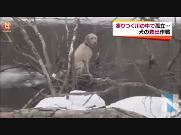 凍りつく川の中で孤立、犬の救出作戦