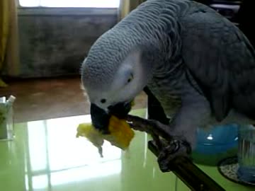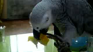 ゆでトウモロコシを食べているヨウム