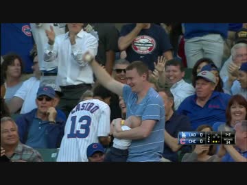 赤ちゃんを抱えながらファールボールをキャッチしたお父さん