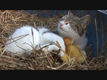 アヒルの赤ちゃんを育てる猫
