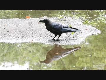 【カラス】水たまりに映るハシブトガラス