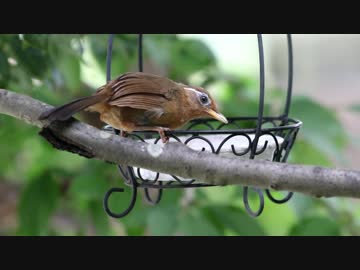 力まかせにヒマワリの種を割って食べるガビチョウ