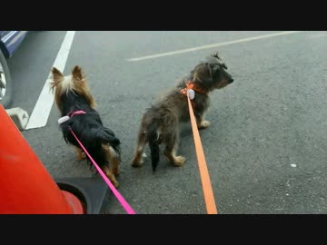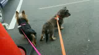 紅葉見ながら散歩する犬達