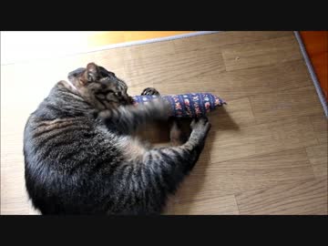 またたび入り手作りキッカーで遊ぶ猫