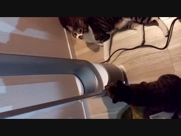 猫が扇風機に挑もうとするが風の出所がわからない