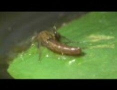 ヤゴにはじき飛ばされるトビムシ