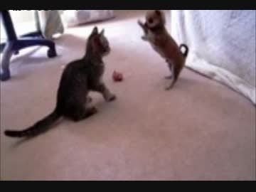 子猫とチワワの子犬のじゃれ合いが微笑ましくてかわいすぎw