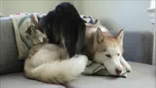 猫がハスキー犬に近づき、熱心にマッサージ開始!その狙いは!?