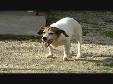 南国の果実 「フェイジョア」をおいしそうに食べる おばあさん犬