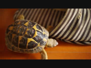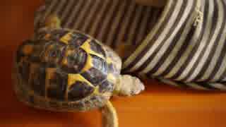 スリッパを追いかけるリクガメ