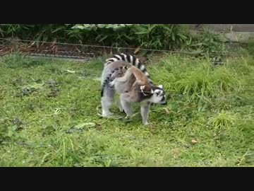 ワオキツネザルの子ザルが親ザルにタスキ掛けに掴まるよ