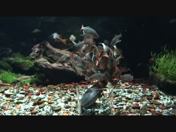 ミヤコタナゴがカイに群がるよ。土台のコップにまで侵入