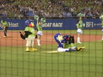 20170726対中日戦花火見物するつば九郎とつばみとドアラ