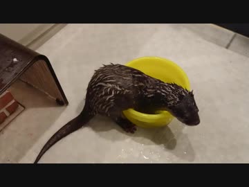 〔無理がある〕ケロリン桶に体を無理やりねじ込むカワウソ