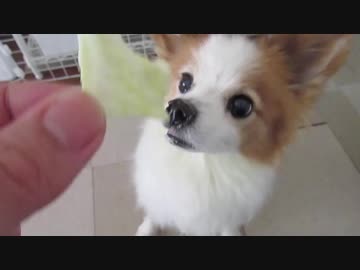 大好きなキャベツと鶏のささみを懸命に追跡するワンコ(パピヨン)