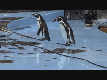 掃除中のプール&シンクロするフンボルトペンギン【埼玉県こども動物自然公園】