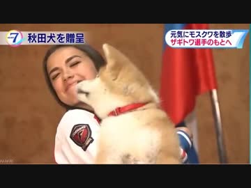 秋田犬「マサル」を受け取り、フィギュアスケートのザギトワ選手笑顔