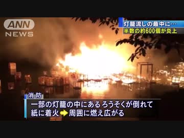 川面の灯籠600個が炎上 ろうそくが倒れ燃え広がる