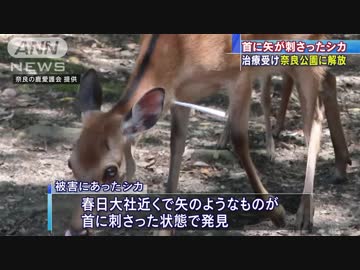 シカの首に“矢” 治療終わり奈良公園に14日朝解放
