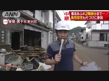 西日本豪雨災害 愛媛県・肱川氾濫で濁流溢れ2階部分まで 野村高校の野球部員も片づけに