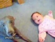 赤ちゃんをどうにかして泣かすまいとする犬