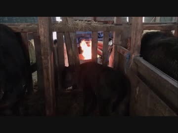 ドラム缶たき火であったまる子牛