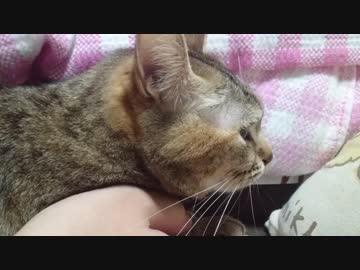 拾いねこ@生後2446/2413日目 パパに抱えられて抗議する月音さん。