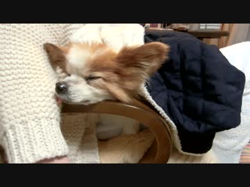 椅子のひじかけをあご枕にするワンコ(パピヨン)