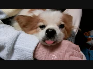 飼い主の手をアゴ枕にするワンコ(パピヨン)