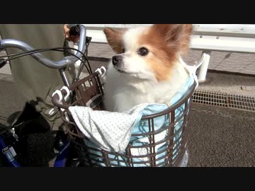 自転車のカゴに乗るワンコ(パピヨン)