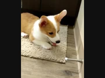 ドアストッパーと戯れるコーギー