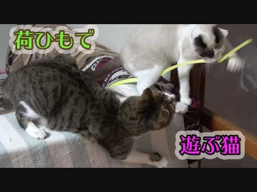 荷ひもで遊ぶ猫