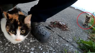 三毛の子猫が野良のサビ猫に襲われた後、かくまってと身を寄せてきた
