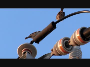 電線の上でじゃれあう鳥たち