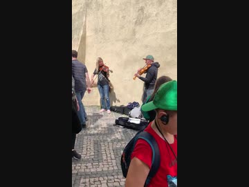 岡正人と路上で弦楽器を演奏する男女