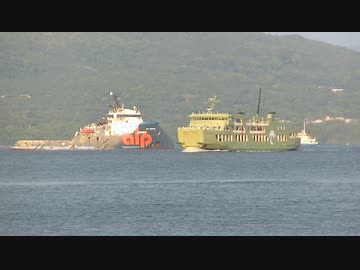 ある日の桜島(その203)<「錦江湾に浮かぶ変わった形状の船」再び>