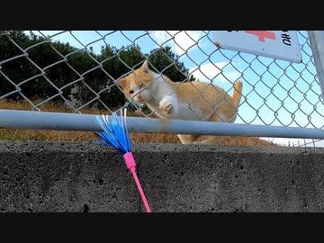 野良猫が猫じゃらしに警戒しながらも反応