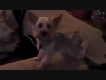 謎の格好で座るワンちゃん