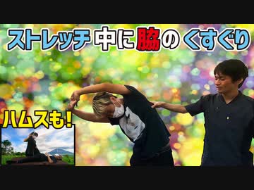 脇こちょこちょで側屈中の男性にくすぐりマッサージ 股関節のモビリゼーションとハムストリングスのストレッチ