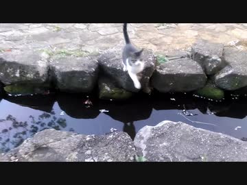川を飛ぶネコ
