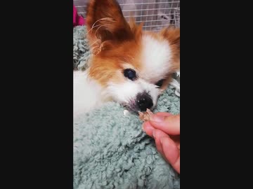 牛肉を嬉しそうに食べるワンコ(パピヨン)