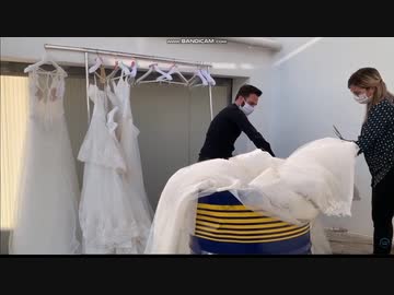 ウェディングドレスを鋏で引き裂き裁断