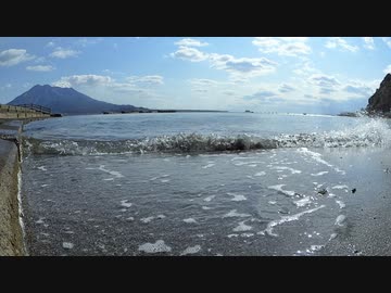 ある日の桜島(その245)<冬の磯海水浴場と波音と桜島>