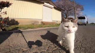 ちょっと目つきの悪い野良猫がカメラのモフモフめがけて猫パンチしてきた