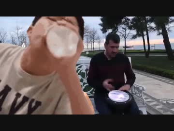 Boy drinking to levan polkka."street drummer with Jap boy"