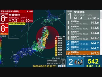 【警報】18時9分 宮城県沖 実測震度5強(強震モニタは6弱)
