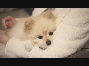 飼い主にひっついてウトウトするポメラニアンモモ