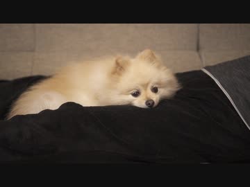 足にくっついてウトウトするポメラニアンモモ
