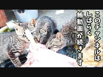 少し凍ったクロマグロをペロペロ、ガジガジしながら解凍する野良猫の子猫【その3】