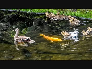 雛に隠れてザリガニを捕食するカルガモ親子の母